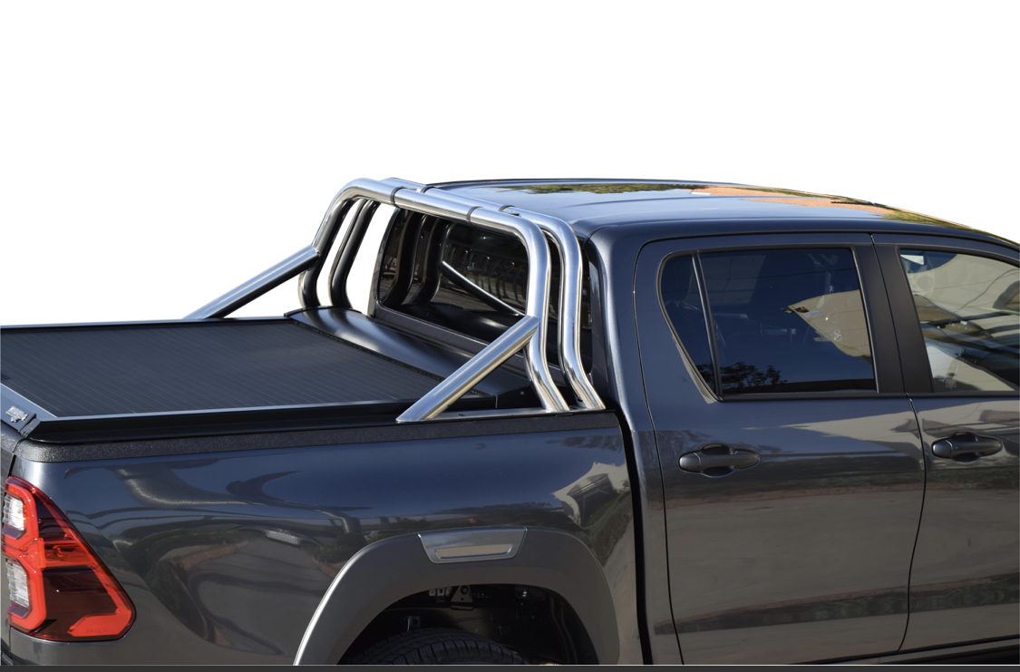 Sport Design Roll bar δύο σκελών (Patent Number: WIPO100520) από ανοξείδωτο σωλήνα Ø65mm, διαιρούμενο για τέλεια προσαρμογή στις διαστάσεις της εκάστοτε καρότσας, πολύ ανθεκτικό για φόρτωση λόγω της ενισχυμένης στήριξης (μονοκόμματη), με ειδική λάμα για την προσθήκη προβολών ομίχλης, και τέλος με την δυνατότητα να παρέχει την μέγιστη προστασία του αμαξώματος σε περίπτωση ανατροπής.